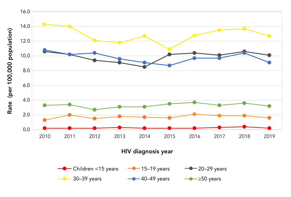 In 2019, data on age groups were available for almost 100% (n=2,120) of all reported HIV diagnoses. The diagnosis rate by age group has remained stable since 2010 for those aged younger than 19 years and those aged 50 years and older. The diagnosis rate has fluctuated slightly over the past 10 years for those in the 20 to 29, 30 to 39 and 40 to 49-year age groups. The 30 to 39-year age group had the highest diagnosis rate throughout the 10-year period; in 2019, the rate was 12.7 per 100,000 population, an overall decrease from 14.3 per 100,000 population in 2010. The 20 to 29-year age group had the second highest rate at 10.1 per 100,000 population in 2019, followed by the 40 to 49-year age group at 9.1 per 100,000 population. In 2019, diagnostic rates of those aged 50 years and older were 3.2 per 100,000 population and of those aged 15 to 19 years were 1.6 per 100,000 population; children less than 15 years old had the lowest diagnostic rate of 0.2 per 100,000 population (Figure 3).