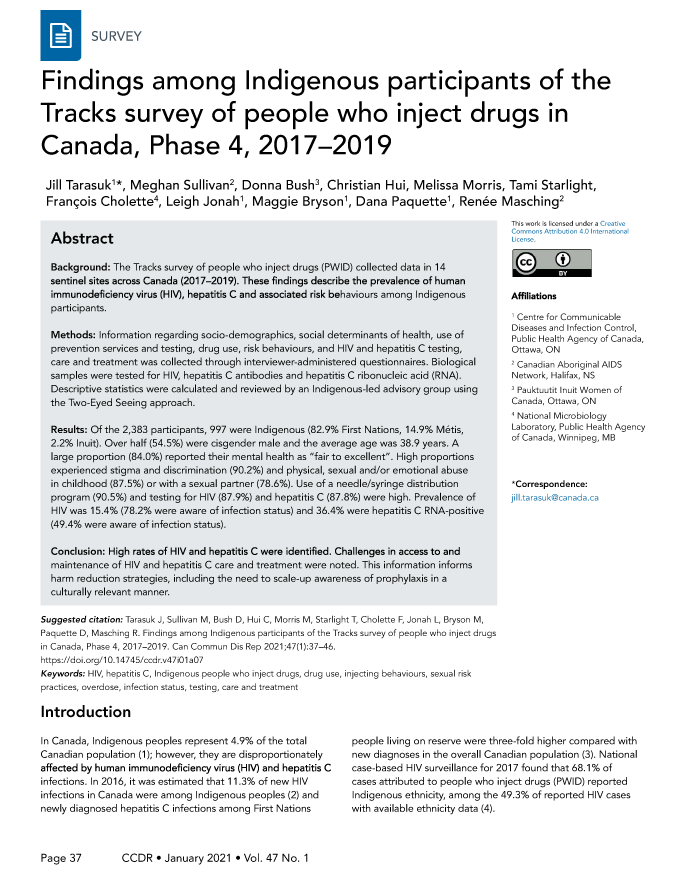 Tarasuk J, Sullivan M, Bush D, Hui C, Morris M, Starlight T, Cholette F, Jonah L, Bryson M, Paquette D, Masching R. Findings among Indigenous participants of the Tracks survey of people who inject drugs in Canada, Phase 4, 2017–2019. Can Commun Dis Rep 2021;47(1):37–46. https://doi.org/10.14745/ccdr.v47i01a07