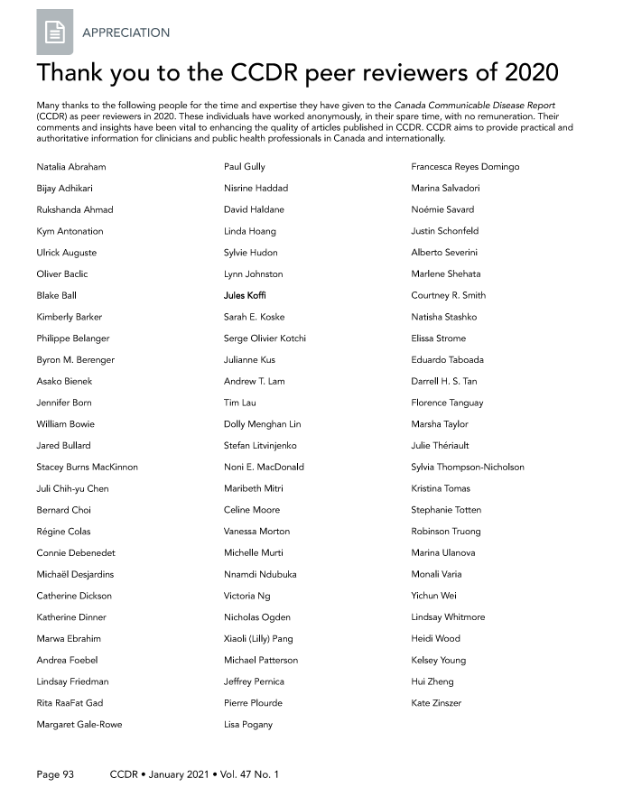 Many thanks to the following people for the time and expertise they have given to the Canada Communicable Disease Report (CCDR) as peer reviewers in 2020. These individuals have worked anonymously, in their spare time, with no remuneration. Their comments and insights have been vital to enhancing the quality of articles published in CCDR. CCDR aims to provide practical and authoritative information for clinicians and public health professionals in Canada and internationally.