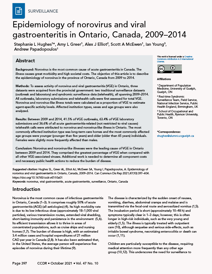 Hughes SL, Greer AL, Elliot AJ, McEwen SA, Young I, Papadopoulos, A. Epidemiology of norovirus and viral gastroenteritis in Ontario, Canada, 2009–2014. Can Commun Dis Rep 2021;47(10):397–404. https://doi.org/10.14745/ccdr.v47i10a01