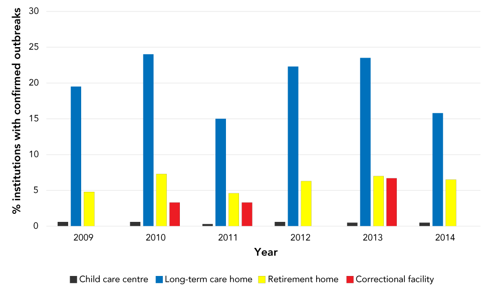 During 2009–2014, 45.1% of VGE outbreaks were in long-term care homes, 30.9% in child care facilities, 22.6% in retirement homes, 0.3% in correctional facilities and 1.2% in other settings. This distribution remained relatively consistent when the analysis was restricted to norovirus outbreaks, in which case retirement homes replaced child care facilities as the second most frequently affected institution type. Of those VGE outbreaks in long-term care homes, more than half (57.2%) were attributed to norovirus. An institutional breakdown for norovirus outbreaks is shown in Figure 1.