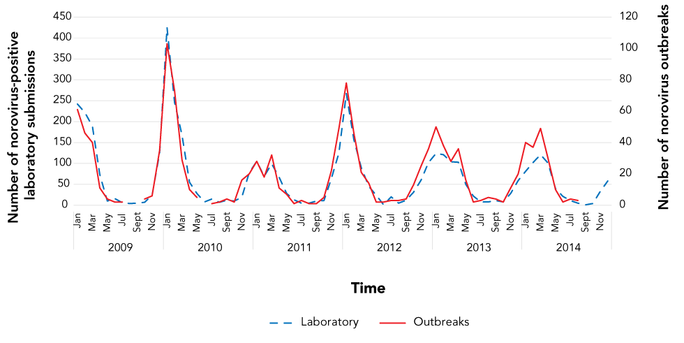 Methods: To assess activity of norovirus and viral gastroenteritis (VGE) in Ontario, three datasets were acquired from the provincial government: two traditional surveillance datasets (outbreak and laboratory) and syndromic surveillance data (telehealth), all spanning 2009–2014. All outbreaks, laboratory submissions and telehealth calls were first assessed for total VGE. Norovirus and norovirus-like illness totals were calculated as a proportion of VGE to estimate agent-specific activity levels. Affected institution types, sexes and age groups were also analyzed.
