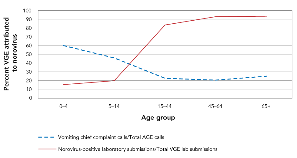 | Age group | Percent vomiting chief complaint calls | Percent norovirus-positive laboratory submissions |