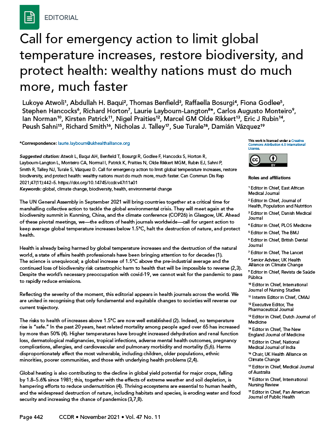 Atwoli L, Baqui AH, Benfield T, Bosurgi R, Godlee F, Hancocks S, Horton R, Laybourn-Langton L, Monteiro CA, Normal I, Patrick K, Praities N, Olde Rikkert MGM, Rubin EJ, Sahni P, Smith R, Talley NJ, Turale S, Vázquez D. Call for emergency action to limit global temperature increases, restore biodiversity, and protect health: wealthy nations must do much more, much faster. Can Commun Dis Rep 2021;47(11):442–5. https://doi.org/10.14745/ccdr.v47i11a01