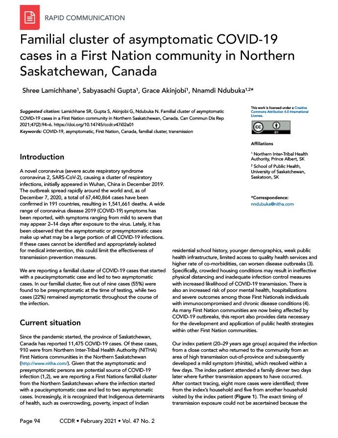 Lamichhane SR, Gupta S, Akinjobi G, Ndubuka N. Familial cluster of asymptomatic COVID-19 cases in a First Nation community in Northern Saskatchewan, Canada. Can Commun Dis Rep 2021;47(2):94–6. https://doi.org/10.14745/ccdr.v47i02a01