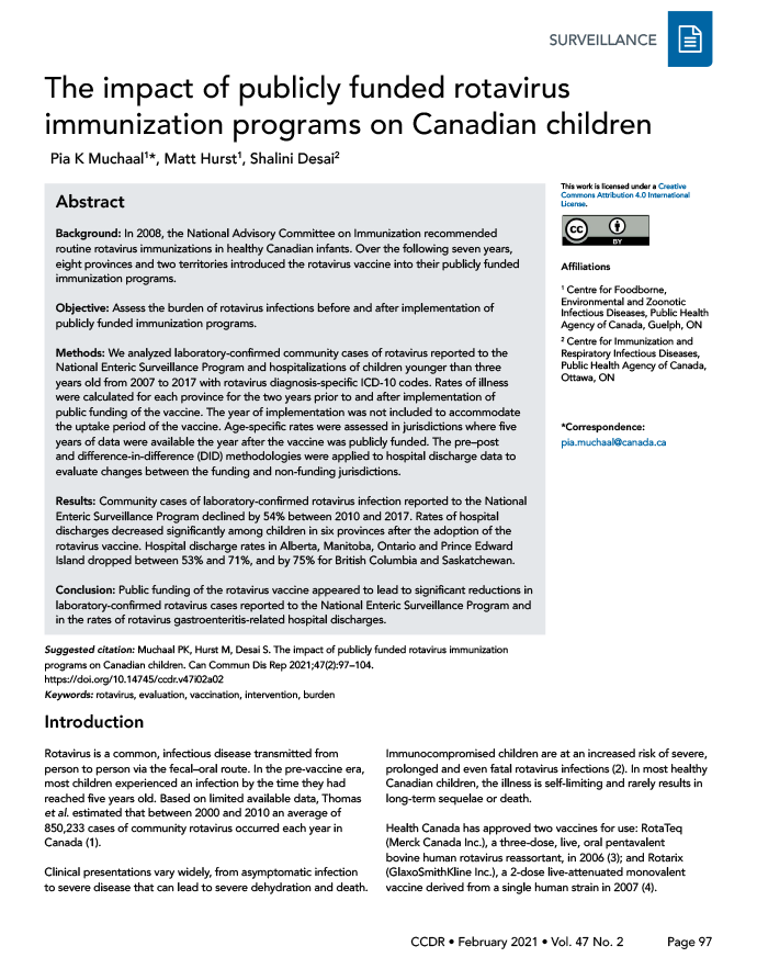 Muchaal PK, Hurst M, Desai S. The impact of publicly funded rotavirus immunization programs on Canadian children. Can Commun Dis Rep 2021;47(2):97–104. https://doi.org/10.14745/ccdr.v47i02a02