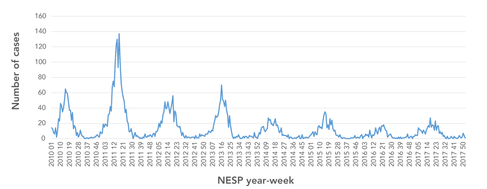 Figure 2: Weekly cases of laboratory-confirmed reported to National Enteric Surveillance Program, 2010–2017