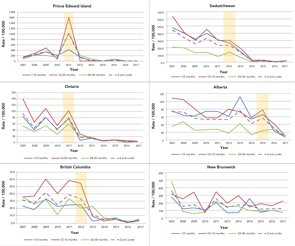 The chart shows the rate (per 100,000 of the population) of rotavirus gastroenteritis cases for 2007 to 2017 for Prince Edward Island, Ontario, British Columbia, Saskatchewan, Alberta and New Brunswick. The post-vaccination period shows lower rates than the pre-vaccination period for Prince Edward Island, Ontario, British Columbia, Saskatchewan and Alberta. For New Brunswick, the trend is largely steady throughout 2007 to 2017.