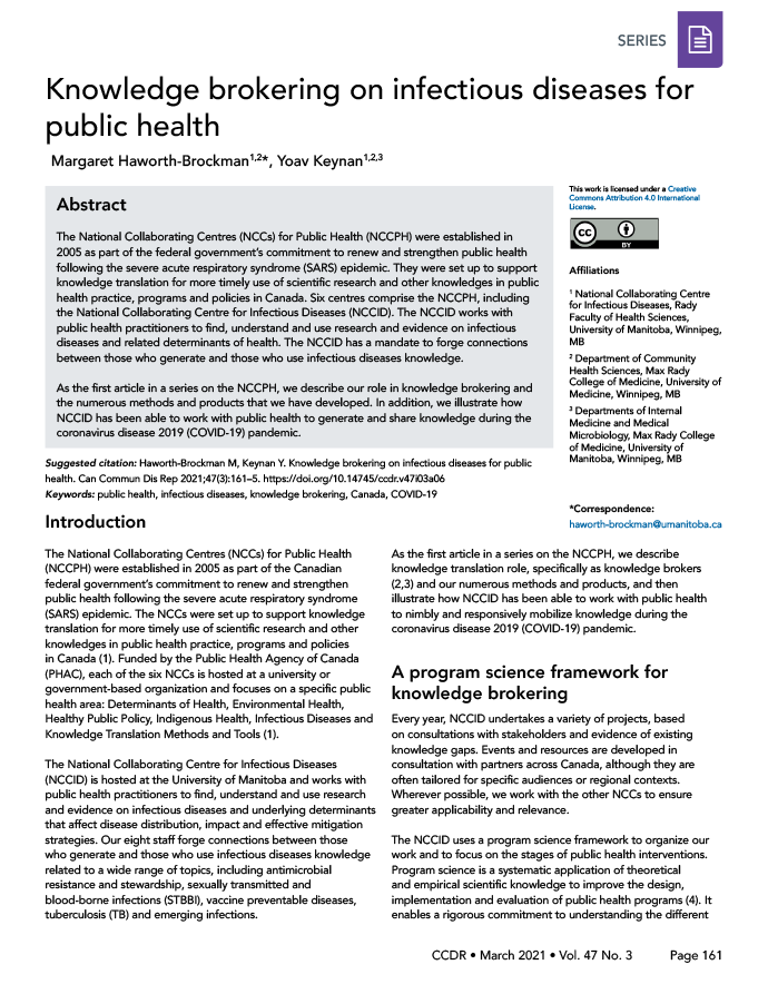 Haworth-Brockman M, Keynan Y. Knowledge brokering on infectious diseases for public health. Can Commun Dis Rep 2021;47(3):161–5. https://doi.org/10.14745/ccdr.v47i03a06