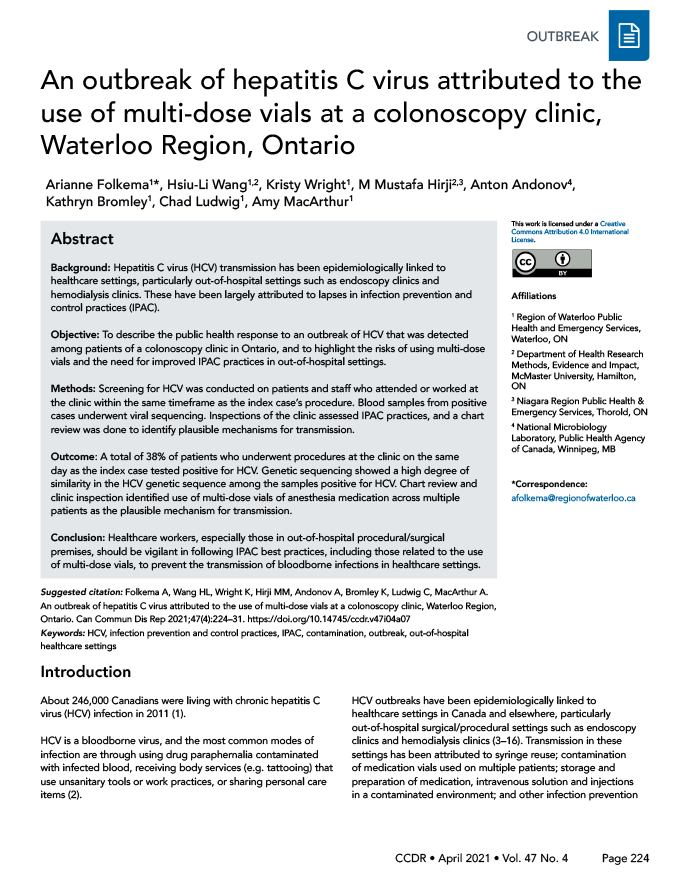 Folkema A, Wang HL, Wright K, Hirji MM, Andonov A, Bromley K, Ludwig C, MacArthur A. An outbreak of hepatitis C virus attributed to the use of multi-dose vials at a colonoscopy clinic, Waterloo Region, Ontario. Can Commun Dis Rep 2021;47(4):224–31. https://doi.org/10.14745/ccdr.v47i04a07