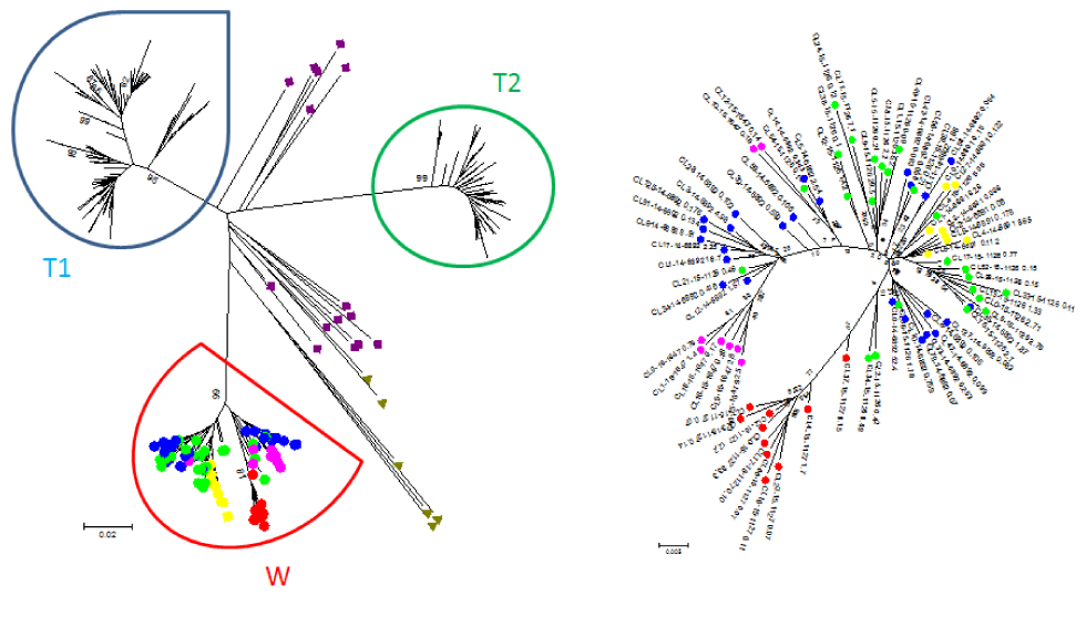 Phylogenetic analysis of HCV HVR-1 quasispecies in samples of five patients involved in a transmission event in outbreak W. Sequences of HCV genotype 1b quasispecies population derived from three different outbreaks (T1, T2 and W), sequences of unrelated HCV strains from Ontario and GenBank (green triangles) and randomly selected HCV strains from Genbank (purple squares) are presented on the left side of the figure. Bootstrap values are shown at the bottom of the nodes. Sequences belonging to the five cases from outbreak W are colour coded and magnified on the right corner of the figure. Each colour dot (node) represents a single HCV variant. Quasispecies of patient #6 (transmission source) green; patient #7 red; patient #8 pink; patient #10 blue; patient #13 yellow. Note that consensus sequences from the unrelated HCV strains from Ontario and GenBank, as well as the quasispecies from two other HCV outbreaks T1 and T2 occupy entirely different sequence space.