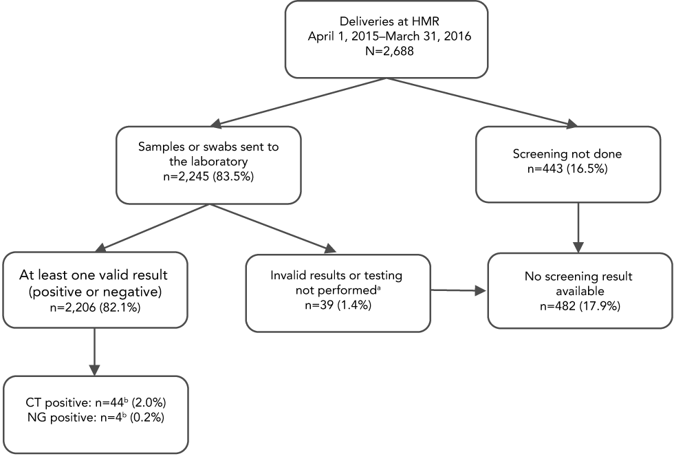 Methods: The list of all women who delivered at a tertiary care hospital in Montréal, Québec, between April 2015 and March 2016, was cross-referenced with the list of samples tested for C. trachomatis and N. gonorrhoeae. Maternal medical records were reviewed for demographic, prenatal and diagnostic information.