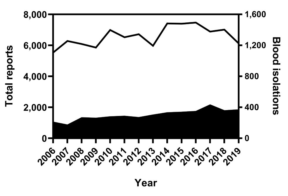 | Year | Total reports | Blood isolations |