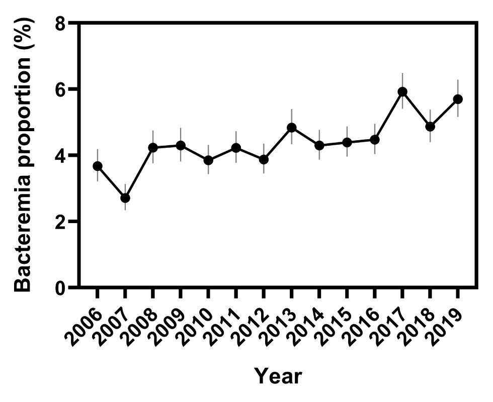 | Year | Bacteremia proportion (%) | 95% confidence interval |