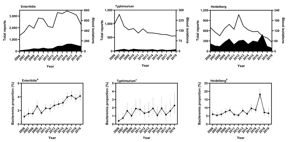 | Salmonella serovar | Year | Total reports | Blood isolations | Bacteremia proportion (%) | 95% confidence interval |