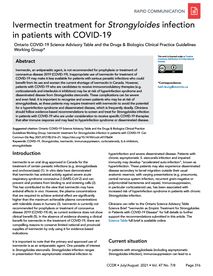 Leung E, Raybardhan S, Graham C, Nott C, Langford BJ, Andany N, Ciccotelli W, Chakrabarti S, Bogoch II, Gold WL, Pai M, Morris AM, McCarthy A. Ivermectin treatment for Strongyloides infection in patients with COVID-19. Can Commun Dis Rep 2021;47(7/8):316–21. https://doi.org/10.14745/ccdr.v47i78a04