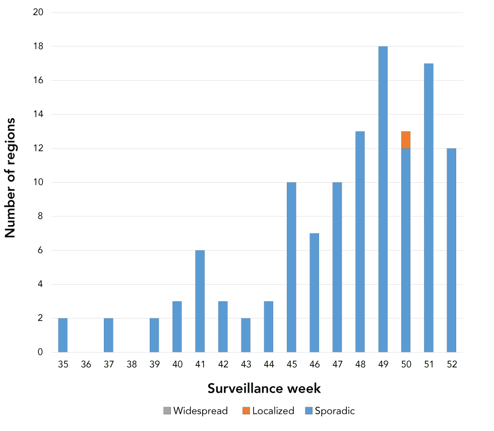 Figure 1: Number of regions reporting sporadic, localized or widespread influenza activity, by epidemiological week, Canada, weeks 35-2021 to 52-2021Table 1 footnote a