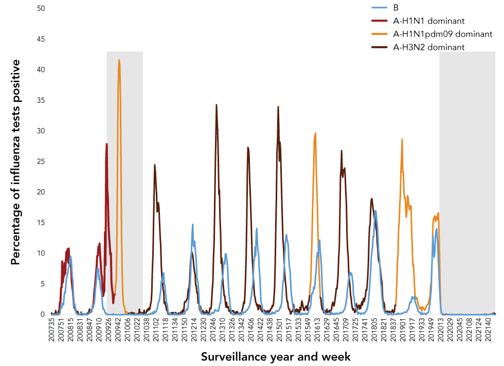 The x-axis shows epidemiological years and weeks 2007-35 to 2021-49. The y-axis shows the percentage of tests positive for influenza (scale from 0% to 50%). The blue line represents influenza B, the graduated color line represents influenza A, with the lightest color indicating A(H1N1)pdm09 predominant seasons, the darker color indicating A(H1N1) predominant seasons and the darkest color indicating A(H3N2) predominant seasons. The grey shaded area denotes the period of the 2009 H1N1 pandemic (June 11, 2009 to August 11, 2010), and of the COVID-19 pandemic (March 11, 2020 and ongoing as of time of publication), as declared by the World Health Organization.