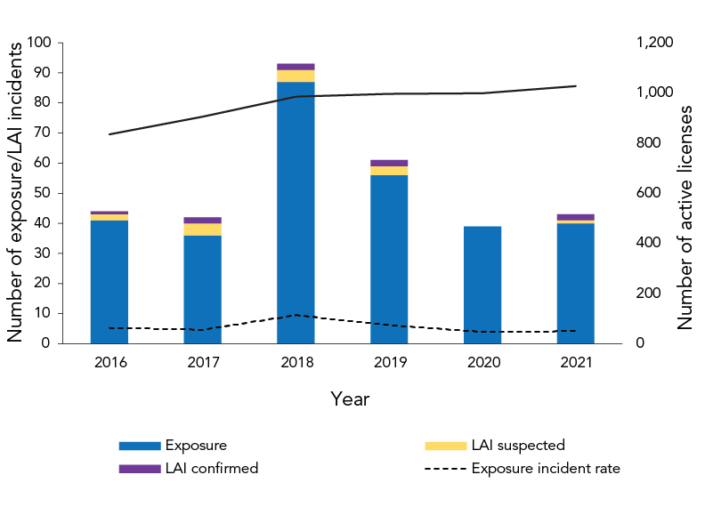 | Year | Type | Number of exposures/LAI incidents |