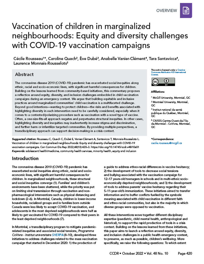 Rousseau C, Quach C, Dubé E, Vanier-Clément A, Santavicca T, Monnais-Rousselots L. Vaccination of children in marginalized neighbourhoods: Equity and diversity challenges with COVID-19 vaccination campaigns. Can Commun Dis Rep 2022;48(10):420–3. https://doi.org/10.14745/ccdr.v48i10a01