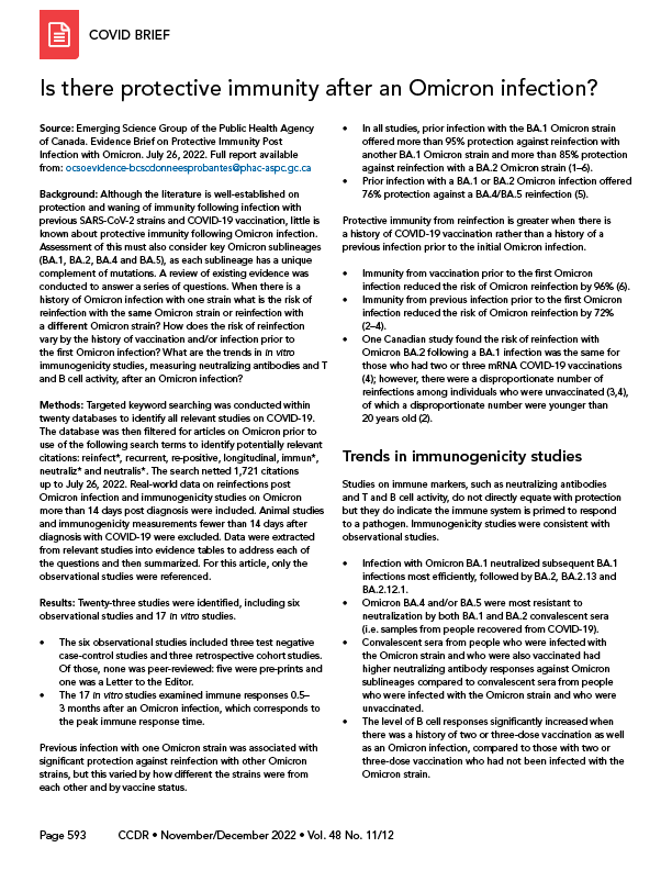 Conclusion: After an initial Omicron infection, the level of protective immunity against an Omicron reinfection varied from 72%–96%, depending on how closely related the two Omicron strains were and the previous vaccination history. Observational evidence was limited by the small number of studies, the lack of peer review, short follow-up times and the risk of bias inherent to retrospective studies. The findings from in vitro immunogenicity studies findings were consistent with the observational studies; however, they were limited in that they were short-term and could only provide indirect evidence of protection. Peer-reviewed prospective studies and longer-term immunogenicity studies are needed.