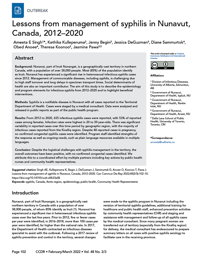 Singh AE, Kulleperuma K, Begin J, DeGuzman J, Sammurtok D, Anoee O, Koonoo T, Pawa J. Lessons from management of syphilis in Nunavut, Canada, 2012–2020. Can Commun Dis Rep 2022;48(2/3):102–10. https://doi.org/10.14745/ccdr.v48i23a08