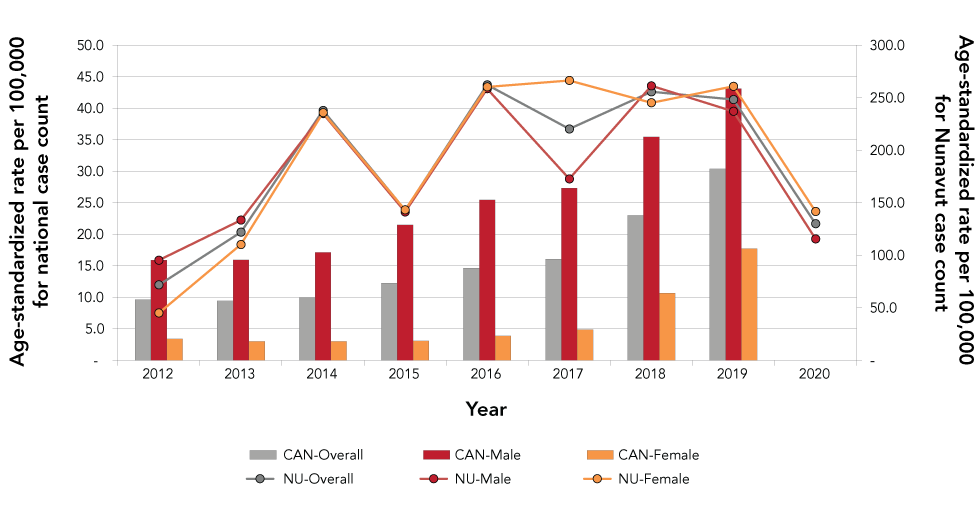 Figure 2: Age-standardized rates of infectious syphilis by sex in Nunavut and Canada, 2012–2020
