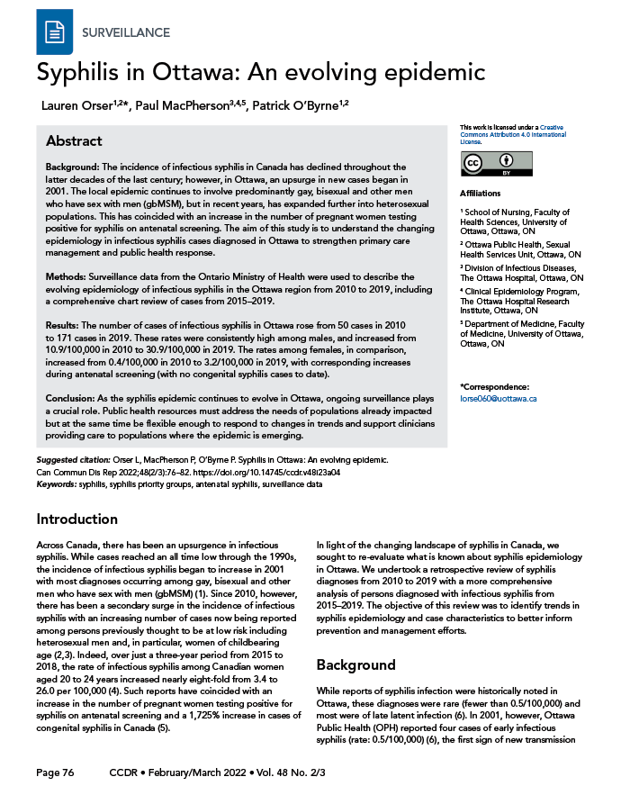 Orser L, MacPherson P, O'Byrne P. Syphilis in Ottawa: An evolving epidemic. Can Commun Dis Rep 2022;48(2/3):76–82. https://doi.org/10.14745/ccdr.v48i23a04