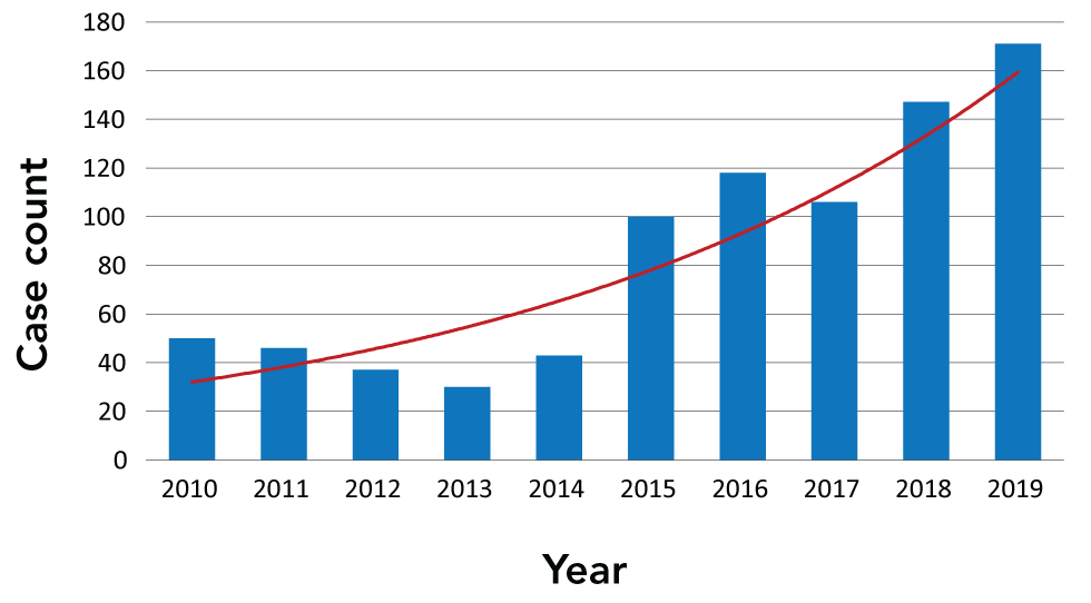 This graph shows the number of infectious syphilis diagnoses reported to the public health unit in Ottawa, Canada from 2010–2019. The number of infectious syphilis cases was relatively stable from the period of 2010–2014, with a slight decline in case numbers. In the latter half of the decade, infectious syphilis diagnoses increased to 100 cases in 2015 and has been steadily increasing since this point, with 171 cases reported at the end of 2019.