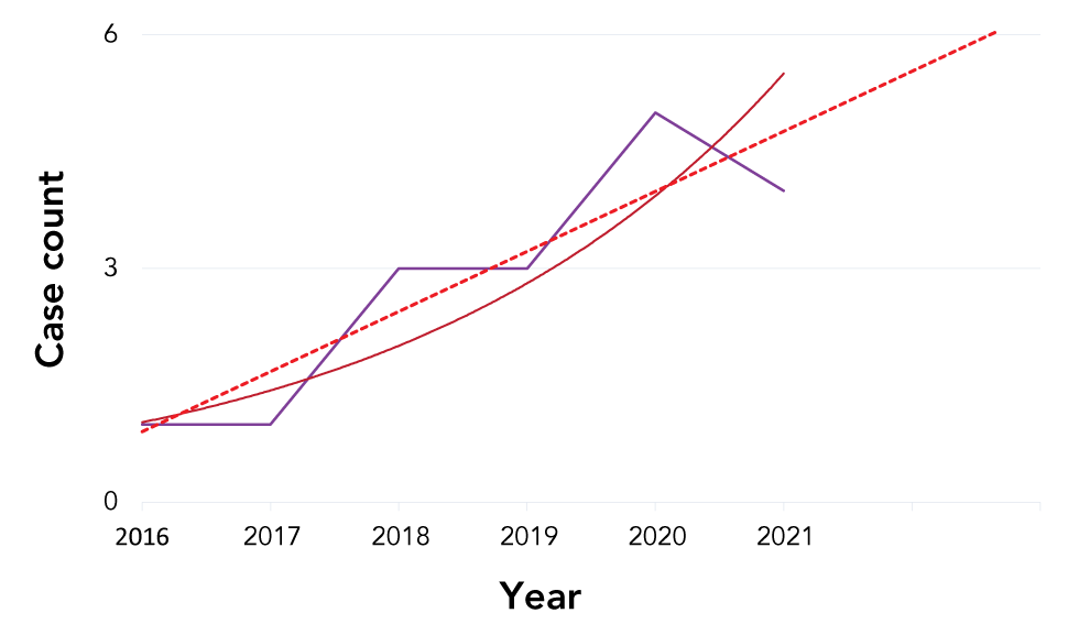 This graph shows the number of syphilis diagnoses identified in pregnant women during antenatal screening from 2016 to mid-2021. The case count from 2015–2017 was one or less; this number has been steadily increasing from 2018 to present. Forecasted trendlines for syphilis diagnoses in pregnancy shows that rates are expected to continue to increase over time. To date, no confirmed cases of congenital syphilis have been reported in Ottawa.