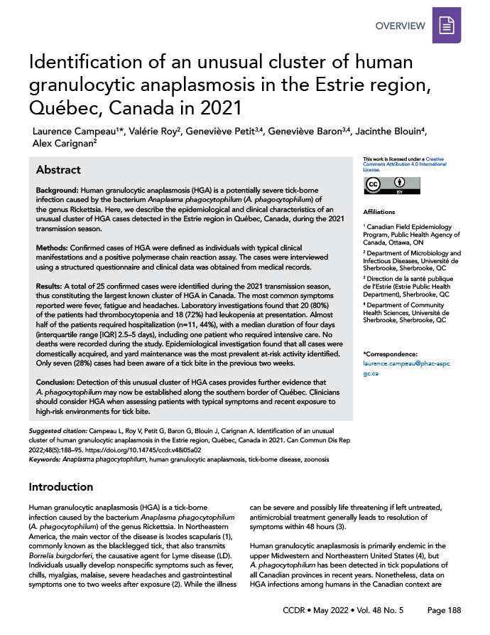 Campeau L, Roy V, Petit G, Baron G, Blouin J, Carignan A. Identification of an unusual cluster of human granulocytic anaplasmosis in the Estrie region, Québec, Canada in 2021. Can Commun Dis Rep 2022;48(5):188–95. https://doi.org/10.14745/ccdr.v48i05a02