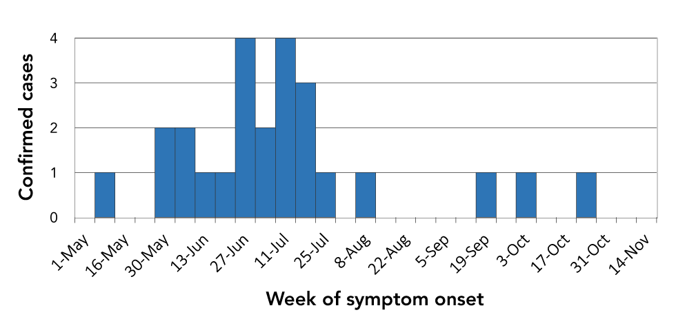 We thank M Gagnon and V Plante (Communicable Disease team Direction de la santé publique de l'Estrie) for their support with data collection and Dr. M Drapeau and Dr. S Perreault (Direction de la santé publique de l'Estrie) for contributing their clinical perspective during the investigation. We also thank Dr. M Kelly and S Michaud, two infectious disease physicians who treated the majority of patients in this case series.