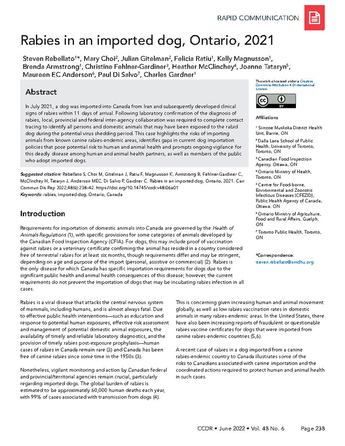 Rebellato S, Choi M, Gitelman J, Ratiu F, Magnusson K, Armstrong B, Fehlner-Gardiner C, McClinchey H, Tataryn J, Anderson MEC, Di Salvo P, Gardner C. Rabies in an imported dog, Ontario, 2021. Can Commun Dis Rep 2022;48(6):238–42. https://doi.org/10.14745/ccdr.v48i06a01