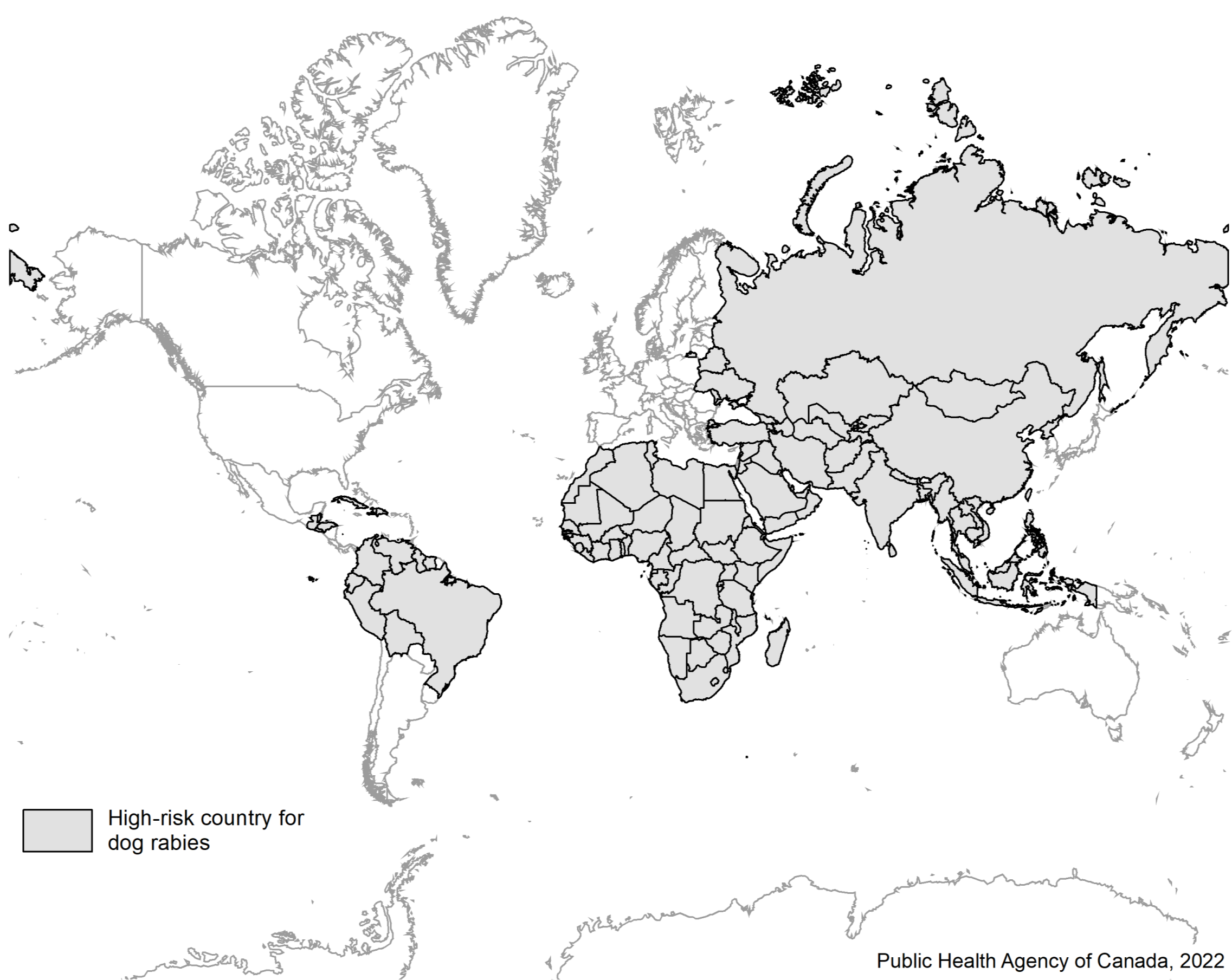 The authors wish to thank the local, provincial, and federal agencies that contributed to the public health investigation, human contact tracing and clinical management which led to the development of this rapid communication. The authors wish to thank J Blackmore (Public Health Agency of Canada, Centre for Food-borne, Environmental & Zoonotic Infectious Diseases) for the development of Figure 1: Map of high-risk countries for dog rabies.