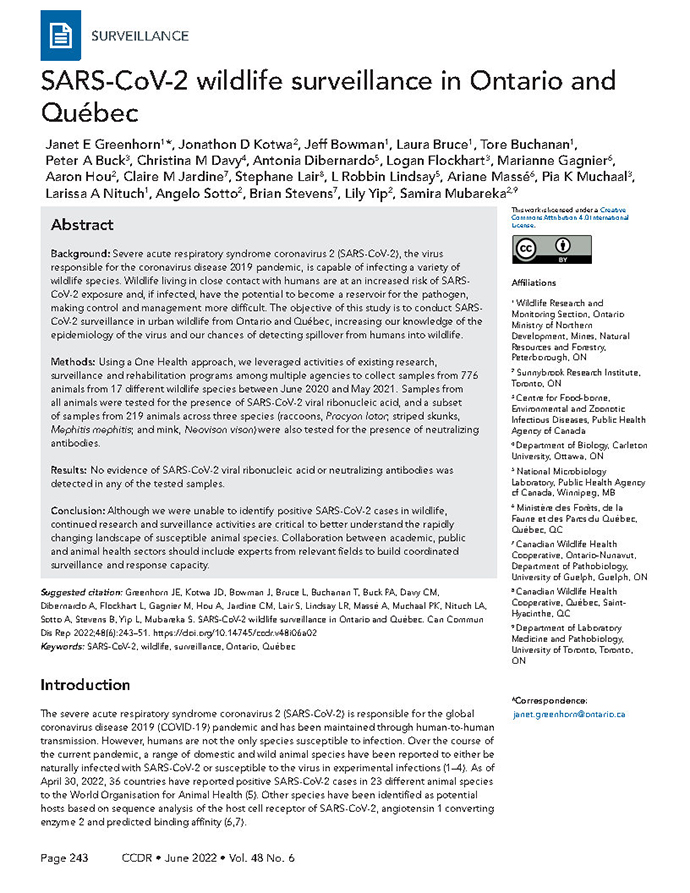 Greenhorn JE, Kotwa JD, Bowman J, Bruce L, Buchanan T, Buck PA, Davy CM, Dibernardo A, Flockhart L, Gagnier M, Hou A, Jardine CM, Lair S, Lindsay LR, Massé A, Muchaal PK, Nituch LA, Sotto A, Stevens B, Yip L, Mubareka S. SARS-CoV-2 wildlife surveillance in Ontario and Québec. Can Commun Dis Rep 2022;48(6):243–51. https://doi.org/10.14745/ccdr.v48i06a02