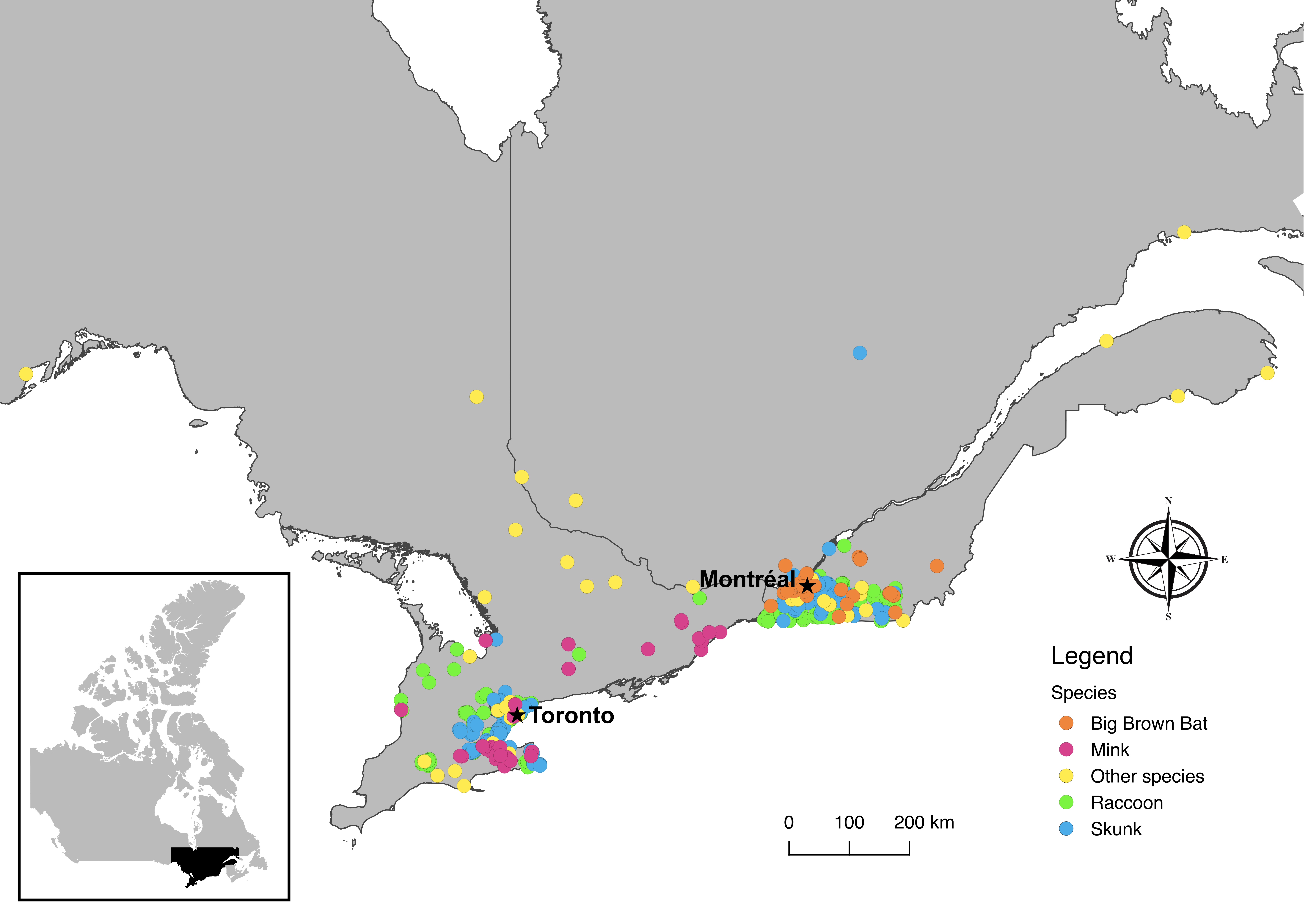 The authors wish to thank B Pickering and J Tataryn for facilitating the inter-agency partnerships that made this work possible, and for their thoughtful review and comments on the manuscript. We also wish to acknowledge B Pickering for helping to arrange antibody testing, and N Toledo for performing the antibody testing. We wish to thank M Anderson of the Ontario Ministry of Agriculture, Food and Rural Affairs and V Misra of the Western College of Veterinary Medicine for their expert advice and participation in discussions regarding this study. We are grateful for the work of D Bulir in developing the PCR testing assay used in this study. We wish to thank L Lazure and the staff of the Granby Zoo, the technicians of the Québec rabies surveillance program, and V Casaubon and J Viau of the Canadian Wildlife Health Cooperative (CWHC) Québec for their help with sample collection. We are also grateful for the sample collection assistance of N Pulham, S Konieczka, J Adams, G McCoy, T McGee, L Pollock, and K Bennett at the Wildlife Research and Monitoring Section of the Northern Development, Mines, Natural Resources and Forestry (NDMNRF) and L Dougherty, L Shirose, and M Alexandrou at the CWHC Ontario. Finally, we wish to thank the licensed fur harvesters who submitted mink for testing.