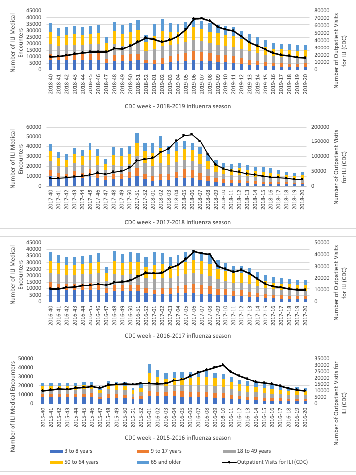 | Influenza-related medical encounters | Influenza-positive specimens (CDC) | Influenza-related medical encounters | Influenza-positive specimens (CDC) | Influenza-related medical encounters | Influenza-positive specimens (CDC) | Influenza-related medical encounters | Influenza-positive specimens (CDC) | |