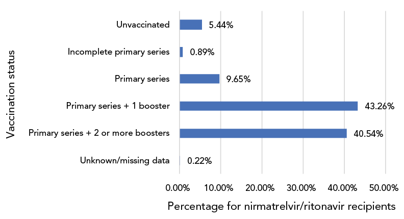 This is a bar graph presenting the vaccination status of nirmatrelvir/ritonavir recipients. There were 5.44% were unvaccinated, 0.89% had received an incomplete primary series, 9.65% has received a completed primary series, 43.26% had received a primary series and one booster dose and 40.54% had received a primary series and two or more boosters. The information was unknown or missing for 0.22% of the recipients.