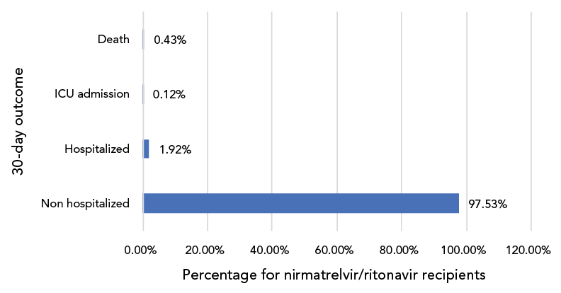 This is a bar graph of the distribution of 30-day outcomes for patients receiving nirmatrelvir/ritonavir during the study period. Ninety-seven point 53% were non hospitalized, 1.92% were hospitalized, 0.12% were admitted to the intensive care unit and 0.43% were deceased.