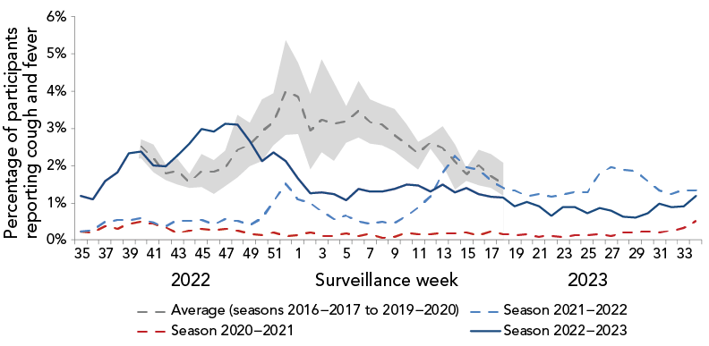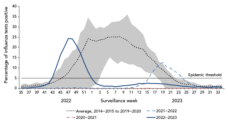 | Surveillance week | 2022–2023 | 2021–2022 | 2020–2021 | Average, 2014–2015 to 2019–2020 |