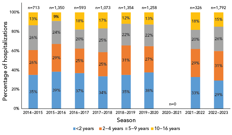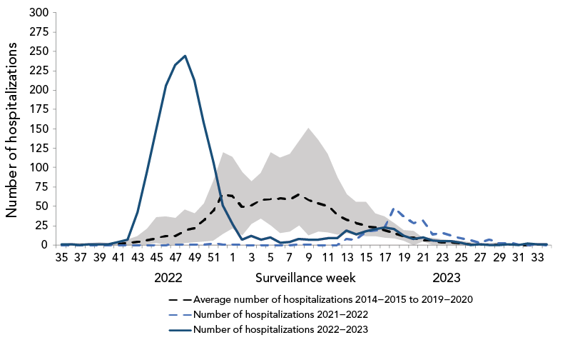 The dominance of influenza A(H3N2) seen during the 2021–2022 Canadian influenza season continued into the 2022–2023 season. Similar to last season, several FluWatch indicators demonstrated that the paediatric population was atypically afflicted. For the second straight season, nearly half of influenza A(H3N2) cases were aged 0–19 years, more than double the average recorded in pre-pandemic years. Additionally, hospitalization rates were once again similar among children aged 0–4 years and adults aged 65 years and older, a distribution not observed during pre-pandemic influenza A(H3N2) predominant epidemics, where burden is typically highest in older adults. Perhaps most notable, the total number of influenza-associated paediatric hospitalizations preliminarily reported by IMPACT during the 2022–2023 influenza season greatly exceeded the total reported in any pre-pandemic season. Weekly paediatric influenza-associated hospitalization admissions were persistently higher than historical peak levels for several weeks during the 2022–2023 season. As was previously hypothesized, the atypical age distribution may reflect immunologic factorsFootnote 9Footnote 10. A large, unexposed cohort of young children may have been more vulnerable to infection following the suppression of seasonal respiratory virus transmission across Canada in recent years. The percentage of hospitalizations in both paediatrics and adults that resulted in ICU admissions was within values previously reported, suggesting that despite the high number of hospitalizations this season, they were not necessarily more severe.