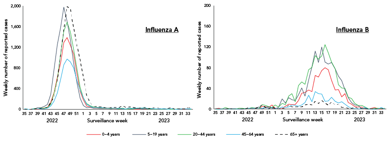 As the 2022–2023 influenza epidemic waned, so did the dominance of influenza A(H3N2), as increased detections of influenza A(H1N1) and influenza B were observed, which was a trend also seen in other Northern Hemisphere regionsFootnote 17Footnote 20. The small wave of influenza B that occurred later in the season mirrored pre-pandemic patterns with its timing. The National Microbiology Laboratory characterized and classified all influenza B viruses as belonging to B/Victoria lineage. As of February 2023, it was reported by the World Health Organization that there had been no confirmed detections of circulating B/Yamagata lineage viruses since before April 2020Footnote 21. Historically, in Canada, the age distribution of influenza B cases has differed between influenza B/Victoria and influenza B/Yamagata predominant seasons. In pre-pandemic seasons, where influenza B/Victoria predominated, the majority of influenza B cases were younger than 45 years of age, while the opposite was true of influenza B/Yamagata predominant seasons. This trend has been reported elsewhere and was notable through the 2022–2023 influenza season in Canada, with 87% of influenza B cases younger than 45 years of ageFootnote 22 Footnote 23 Footnote 24 Footnote 25. If influenza B/Yamagata community circulation does not return, there may be future implications for how populations are affected by influenza B.