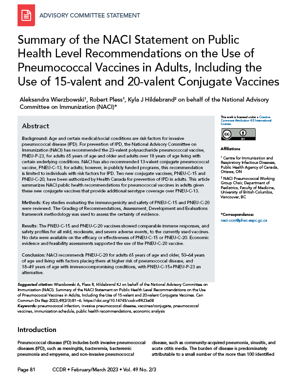 Wierzbowski A, Pless R, Hildebrand KJ on behalf of the National Advisory Committee on Immunization (NACI). Summary of the NACI Statement on Public Health Level Recommendations on the Use of Pneumococcal Vaccines in Adults, Including the Use of 15-valent and 20-valent Conjugate Vaccines. Can Commun Dis Rep 2023;49(2/3):81–6. https://doi.org/10.14745/ccdr.v49i23a08