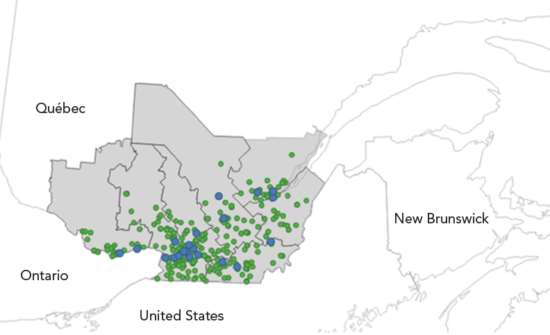 The Institut national de santé publique du Québec (INSPQ) and Ministère de la santé et des services sociaux (MSSS) funded data collection in sampling sites across Québec as part of annual surveillance activities. The Laboratoire de Santé Publique du Québec (LSPQ) identified the species of tick specimens collected. The National Microbiology Laboratory confirmed the species and undertook the testing of ticks for tick-associated pathogens.