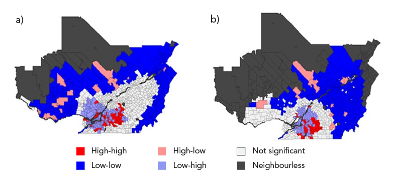 Interpolated data at the municipal level across Québec were used in local bivariate Moran's I to see if nymph densities collected during active surveillance methods were associated with the degree of LD risk (number of human cases/logarithm of the population (Figure 3). The cluster maps show whether there is significant spatial association between these two variables. Accessory site data had a greater proportion of non-significant classifications (n=490, 46.4%) compared to sentinel site data (n=348, 33.0%) (Table 2). Limited number of sampling sites during active surveillance meant that some of the study zone was undefined or neighbourless in the analyses, as no data was collected in these areas to incorporated within the analysis.