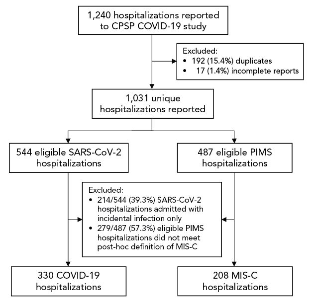 The flowchart describes the flow of case reports submitted to the Canadian Paediatric Surveillance Program (CPSP) COVID-19 study, and how they were processed to reach the final analysis sample size. Overall, the CPSP COVID-19 study received 1,240 case reports of hospitalized children which were eligible to be analyzed in this study. Among these case reports, 192 (15.4%) duplicates and 17 (1.4%) incomplete reports were removed. Therefore, 1,031 unique hospitalizations with complete reports were reported and included 544 eligible hospitalizations of SARS-CoV-2 hospitalizations and 487 eligible hospitalizations of paediatric inflammatory multisystem syndrome (PIMS). From these subtotals, 214/544 (39.3%) SARS-CoV-2 hospitalizations were excluded because they were admitted with incidental infection only, while 279/487 (57.3%) PIMS hospitalizations were excluded because they did not meet the post hoc case definition of multisystem inflammatory syndrome in children (MIS-C). Therefore, the analysis included 330 COVID-19 hospitalizations and 208 MIS-C hospitalizations.