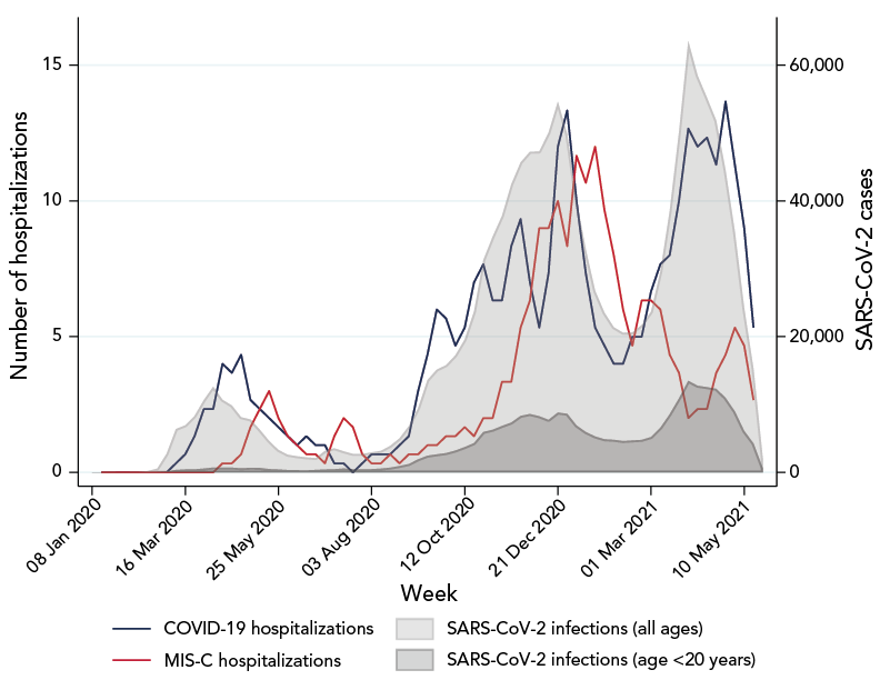 Payne AB, Gilani Z, Godfred-Cato S, Belay ED, Feldstein LR, Patel MM, Randolph AG, Newhams M, Thomas D, Magleby R, Hsu K, Burns M, Dufort E, Maxted A, Pietrowski M, Longenberger A, Bidol S, Henderson J, Sosa L, Edmundson A, Tobin-D'Angelo M, Edison L, Heidemann S, Singh AR, Giuliano JS Jr, Kleinman LC, Tarquinio KM, Walsh RF, Fitzgerald JC, Clouser KN, Gertz SJ, Carroll RW, Carroll CL, Hoots BE, Reed C, Dahlgren FS, Oster ME, Pierce TJ, Curns AT, Langley GE, Campbell AP, Balachandran N, Murray TS, Burkholder C, Brancard T, Lifshitz J, Leach D, Charpie I, Tice C, Coffin SE, Perella D, Jones K, Marohn KL, Yager PH, Fernandes ND, Flori HR, Koncicki ML, Walker KS, Di Pentima MC, Li S, Horwitz SM, Gaur S, Coffey DC, Harwayne-Gidansky I, Hymes SR, Thomas NJ, Ackerman KG, Cholette JM; MIS-C Incidence Authorship Group. Incidence of Multisystem Inflammatory Syndrome in Children Among US Persons Infected With SARS-CoV-2. JAMA Netw Open 2021;4(6):e2116420. https://doi.org/10.1001/jamanetworkopen.2021.16420