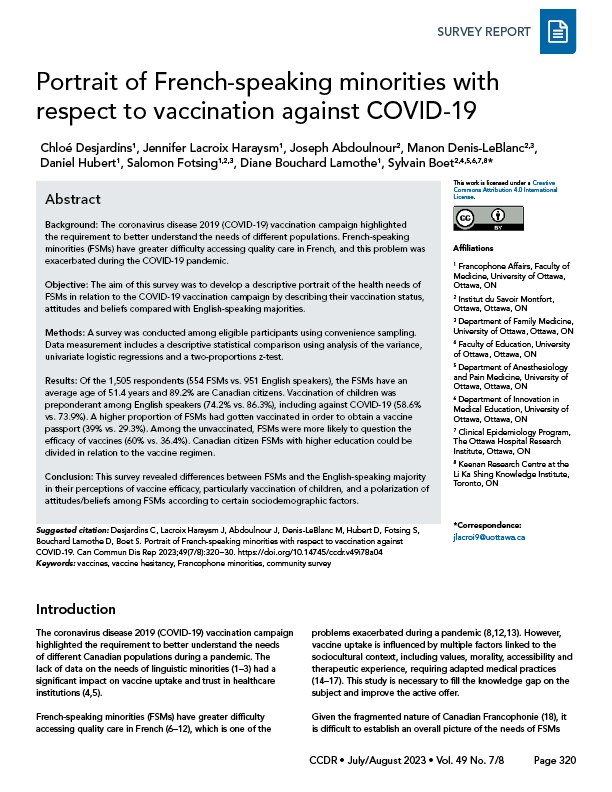 Desjardins C, Lacroix Haraysm J, Abdoulnour J, Denis-LeBlanc M, Hubert D, Fotsing S, Bouchard Lamothe D, Boet S. Portrait of French-speaking minorities with respect to vaccination against COVID-19. Can Commun Dis Rep 2023;49(7/8):320–30. https://doi.org/10.14745/ccdr.v49i78a04