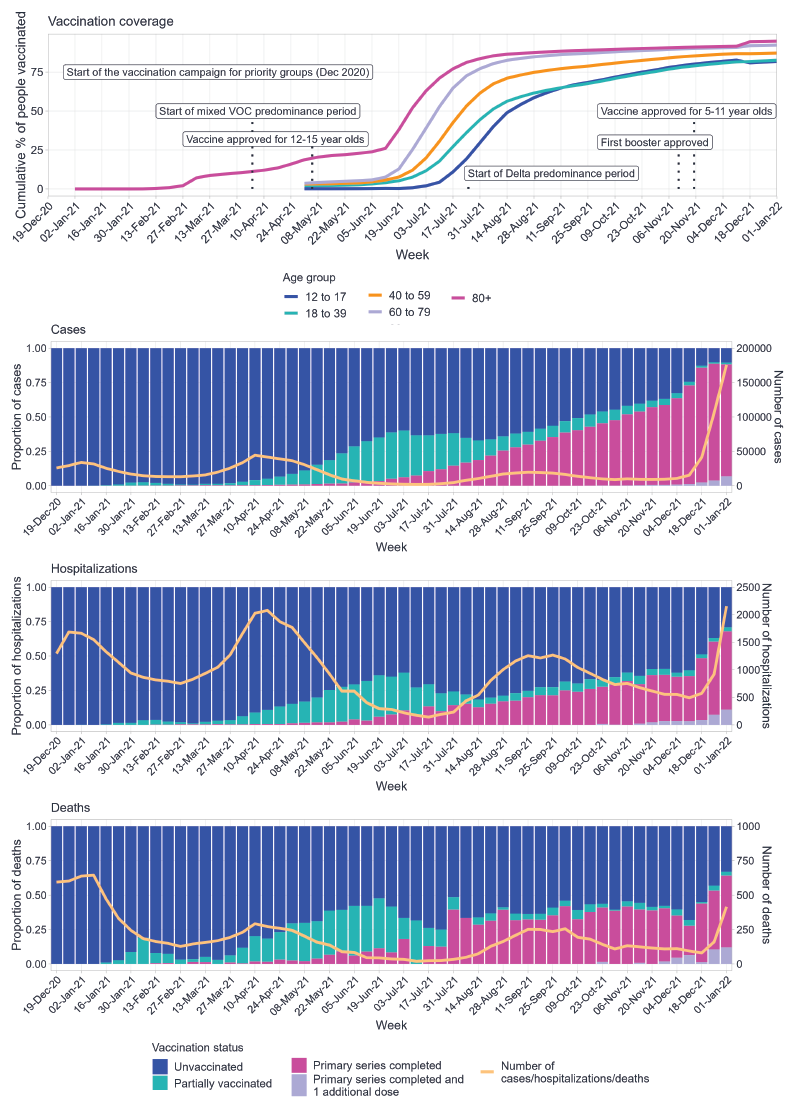 Objective: This surveillance report provides a retrospective descriptive analysis of national trends in COVID-19 cases and severe outcomes by vaccination status, contextualizing trends against case demographics and circulating VOCs, from December 2020 to January 2022.