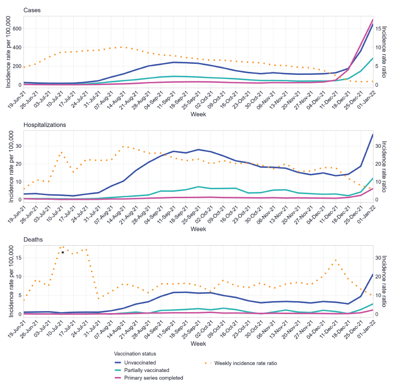 Figure 2 displays three line plots of the weekly age-standardized incidence rate of COVID-19 cases (top panel), hospitalizations (middle panel), and deaths (bottom panel) per 100,000 population by vaccination status from June 19, 2021, to January 1, 2022. Each plot also shows a dotted line representing the weekly incidence rate ratio of the unvaccinated incidence rate over the incidence rate for those with a complete primary series. In all three plots, the incidence rate was highest among those who were unvaccinated, followed by those who were partially vaccinated, and the lowest incidence rates were in those who completed a primary series. In late 2021, there was a large increase in cases and the incidence rate of cases with a complete primary series surpassed that of the other two vaccination status groups; however, this increase was only observed in cases while trends remained the same throughout the year for hospitalizations and deaths with the lowest rates being in those with a complete primary series.